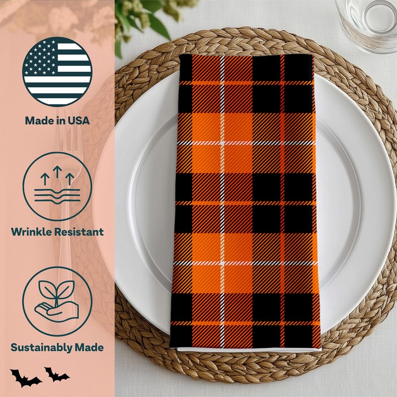 Black and Orange Plaid Fall Napkins | Home Dining Room and Kitchen | Absorbent, Washable, Reusable, Stain & Wrinkle Resistant | USA Made - 12pack