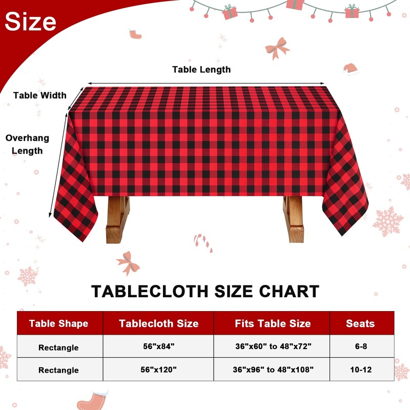 - Plaid Tablecloth: 56x84 Inch Rectangular Tablecloth, suitable for tables that can accommodate 6-8 people.