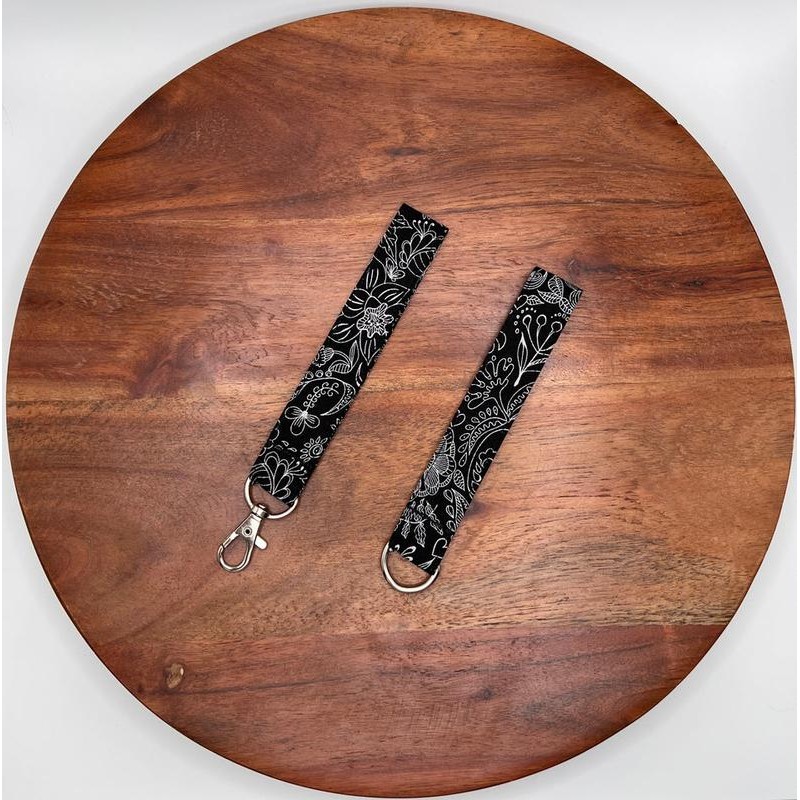 Black and White Fine Line Floral Lanyard - Length: Wristlet, Clasp: Swivel Clasp