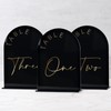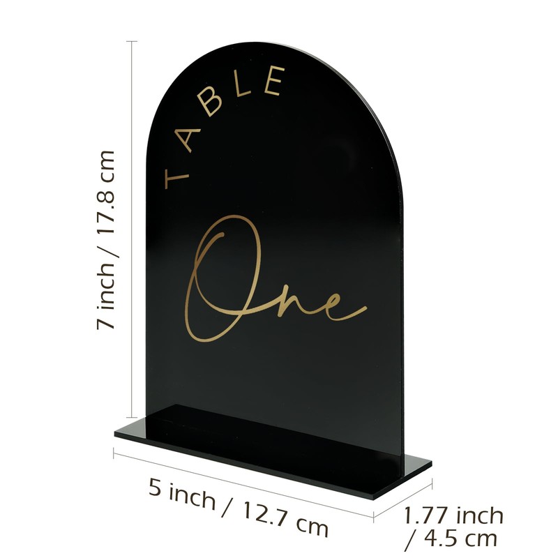 - PACKAGE INCLUDES: 5x7 inch acrylic table numbers black and gold 1-15 with black acrylic stand, total 15 sets in one pack. Each black acrylic arch signs Has A Protective Film On Both Sides To Prevent Scratches and when you are ready to use it, you should peel it off.