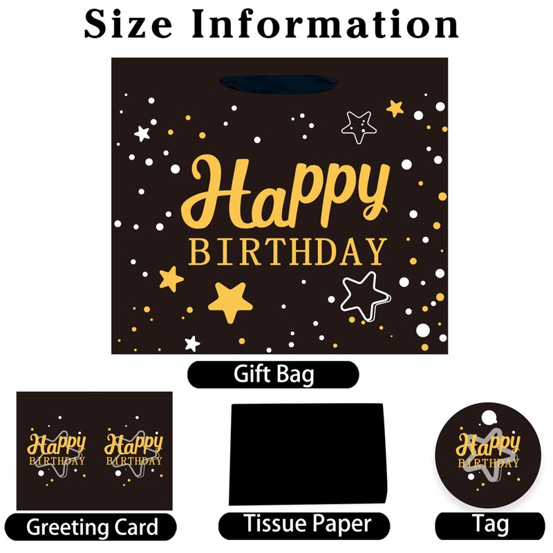 - Happy Birthday Bag:The 1-piece set includes one bag, one greeting card, and 3 paper towels. The bag measures 13" wide × 10.2" high × 4.7" long, and the greeting card measures 7.9" wide × 5.9" high.