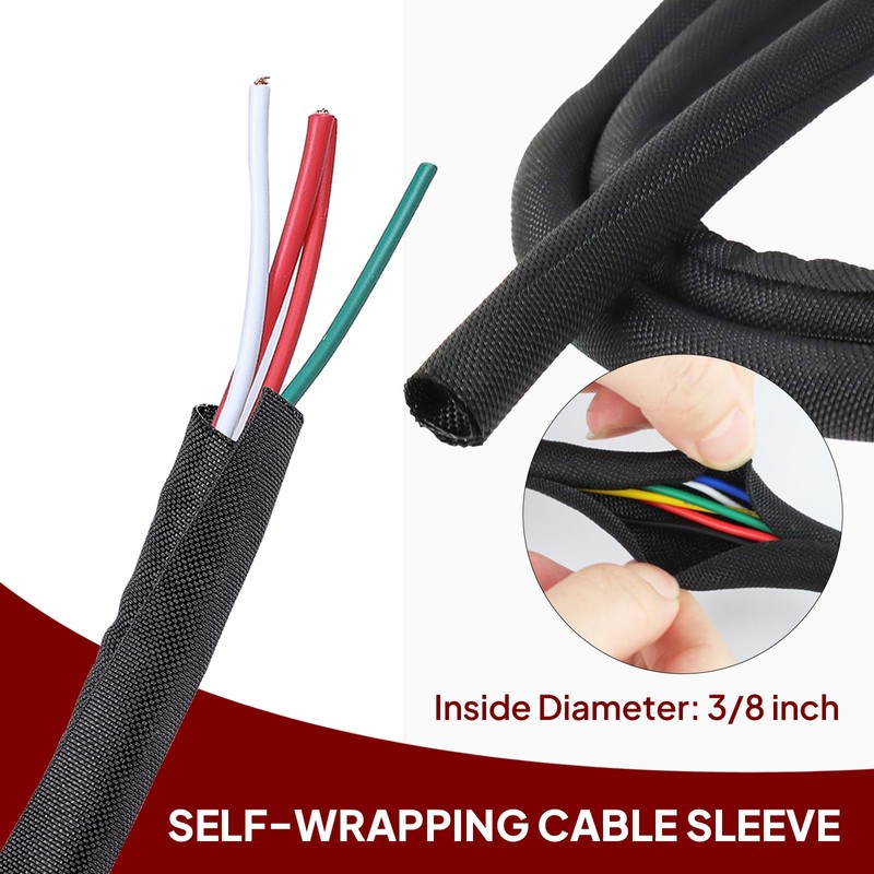 Black Braided Cable Management Sleeves Wire Loom Tubing Cord Protector Self-Wrapping (3/8"-20Feet)