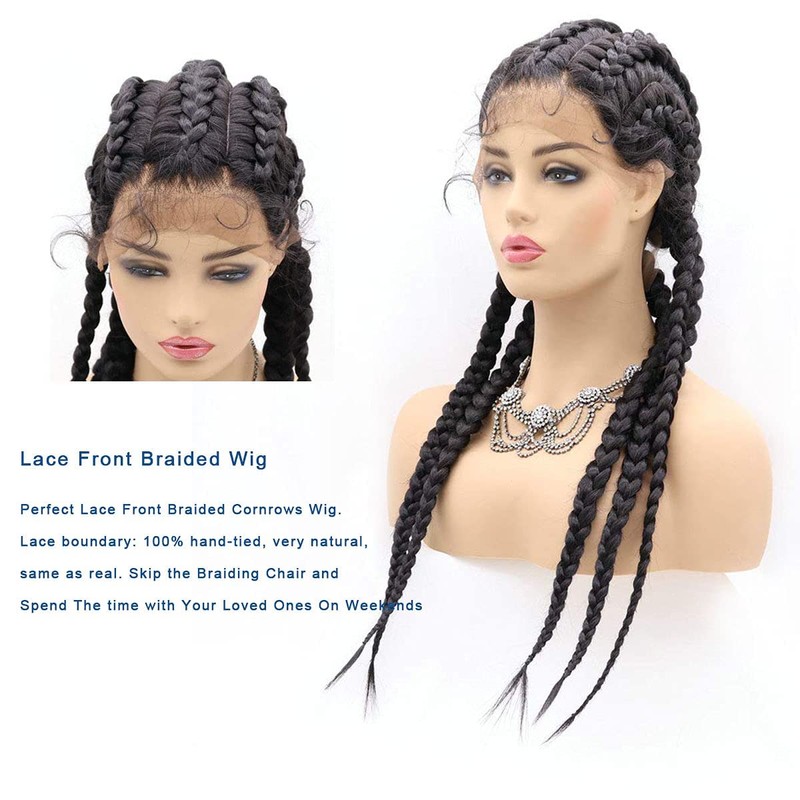 - LACE FRONT BRAIDED WIGS FEATURE: hand-braided super lightweight Cornrow lace front braided wigs with 5 Braid Ponytails, Realistic and Natural, Brings You Spend Less Time and Money to Have a Perfect Braid Hairstyle, Skips Your Trip to The Salon,This quality heat friendly fiber can be up to 180 ℃, it's very soft and natural even looks like as real hair, and it can be heated and styled as you like.The most important is that the hair won't tangle easily, you can easy to brush the hair