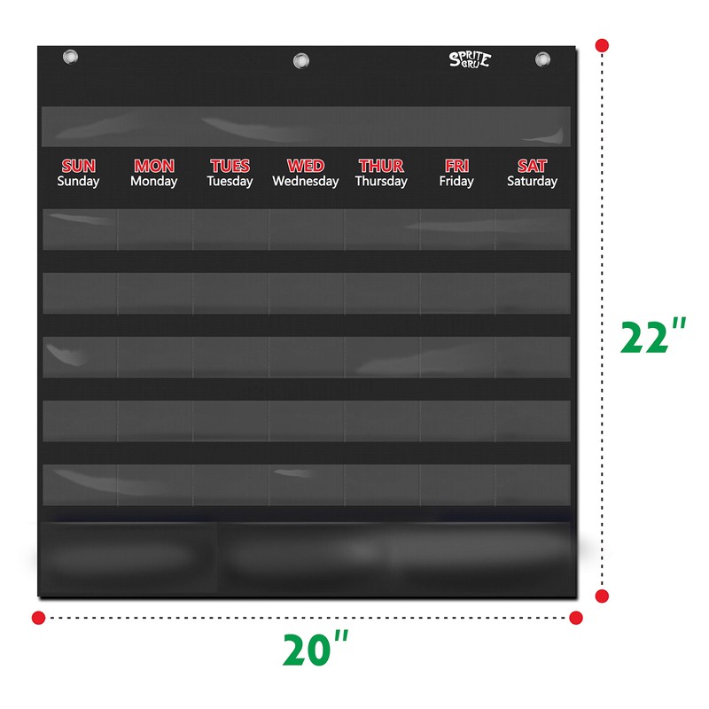 Black Calendar and Weather Pocket Chart with 104 Cards,(72 Illustrated Activity Cards, 32 Dry Erasable Flash Cards and 3 Hooks 20” X 22”)