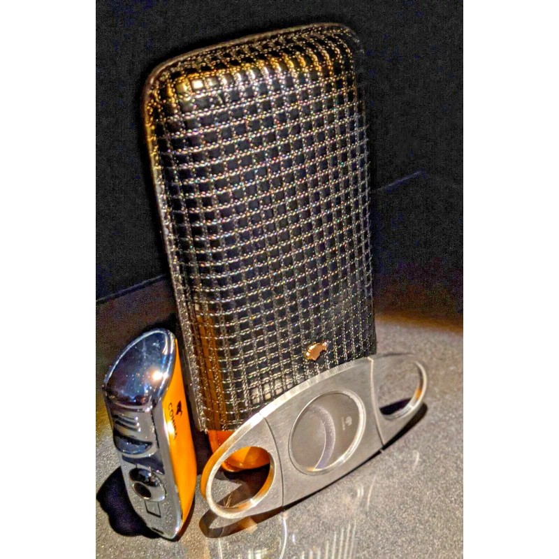 Black Cigar Carrying case with cutter and lighter This is a new Black cigar carrying case with stainless steel large ring guage cutter and lighter. All in original boxes. We Ship Worldwide fully insured.