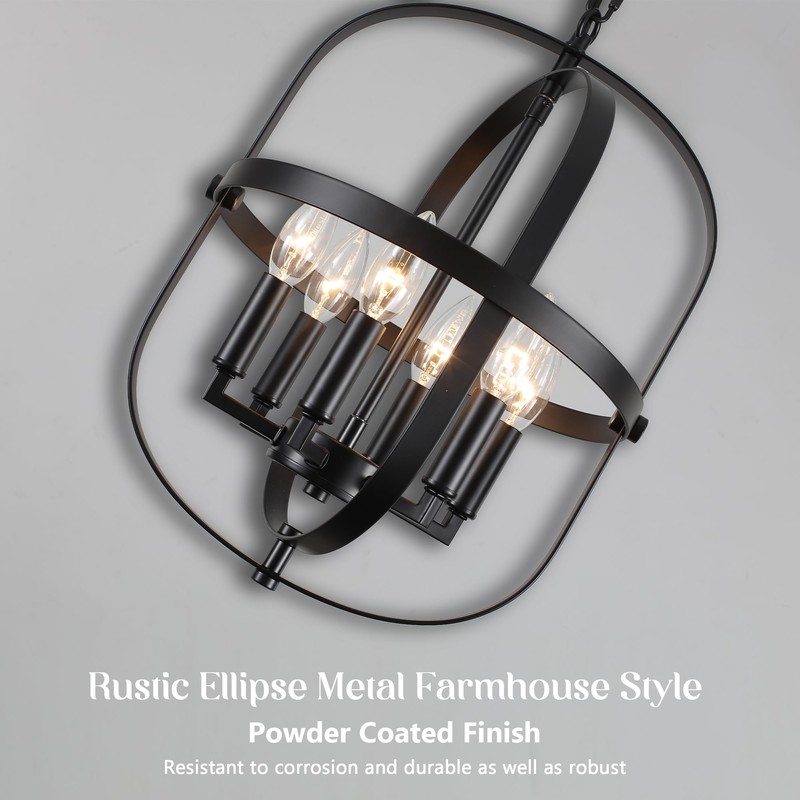 - ✔Unique 6 Light Oval Farmhouse Design:This 6-light Black Chandelier, boasting a unique high-quality oval lantern-shaped frame, blends farmhouse design with modern chic, ideal as a Dining Room Light Fixture and versatile Hanging Light Fixture. It fits 6 E12 candle light bases (max 40W, bulbs not included) with adjustable lighting,compatible with Edison bulbs, incandescent bulbs, CFLs and LED bulbs,compatible with Edison bulbs, incandescent bulbs, CFLs and LED bulbs