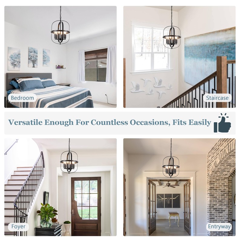 - ✔Wide Application:Universal 180°ceiling plate installs seamlessly on flat, sloped, or arched ceilings—position this versatile black chandelier anywhere!Whether indoors (kitchen, dining room, kitchen island, stairwell, entryway, living room) or outdoors (gazebo, exterior entry),this hanging light fixture adds a stylish ambiance blending modern sleekness with farmhouse charm, complementing various decor styles seamlessly.