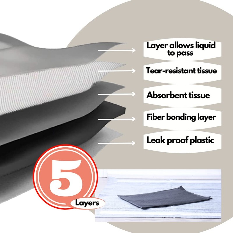 - [SUPER ABSORBENT] This carbon training pads are thick and absorbs twice the amount of liquid than normal training pads. Each pad features 5 layers, which are designed to keep your floor clean and dry. We use Carbon Technology on the top layer to provide max absorption and remove odor quickly. In the middle layers, liquid is turned into gel that holds more fluid than your typical training pad.