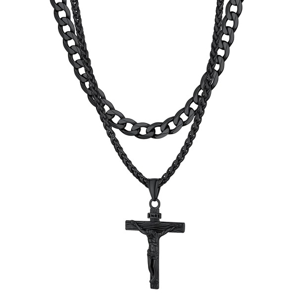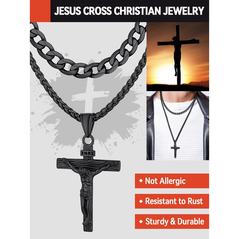 Black Crucifix Pendant Necklace for Men Jesus Christ Amulet Necklaces High Polished Stainless Steel Tarnish Resistant Waterproof Chains