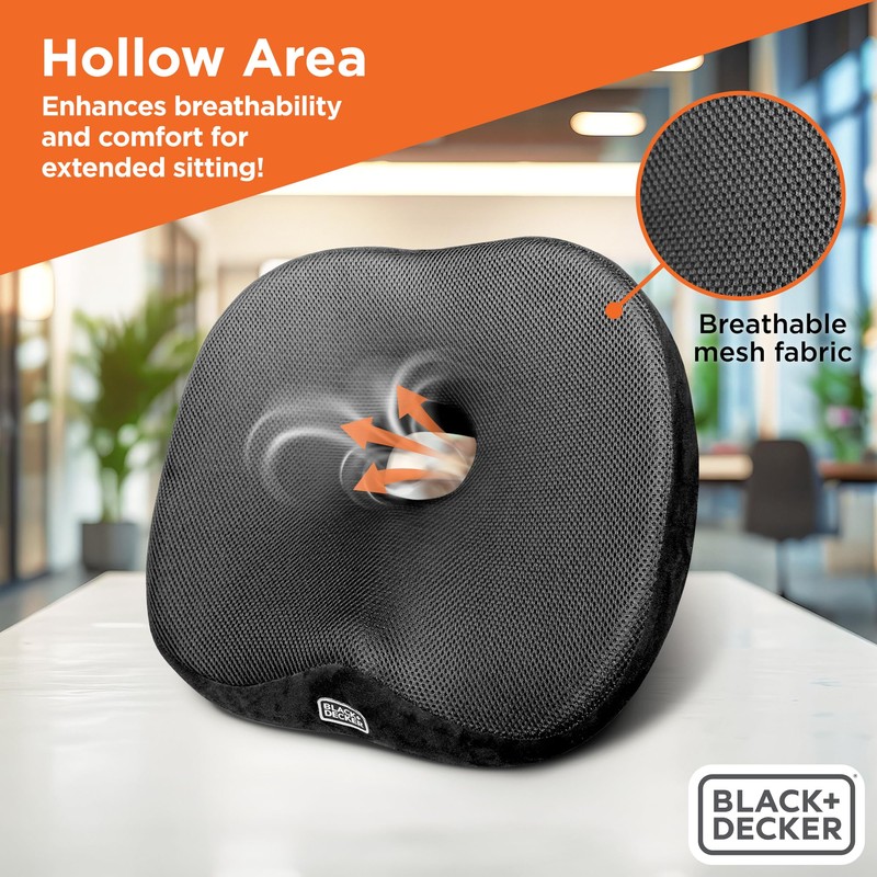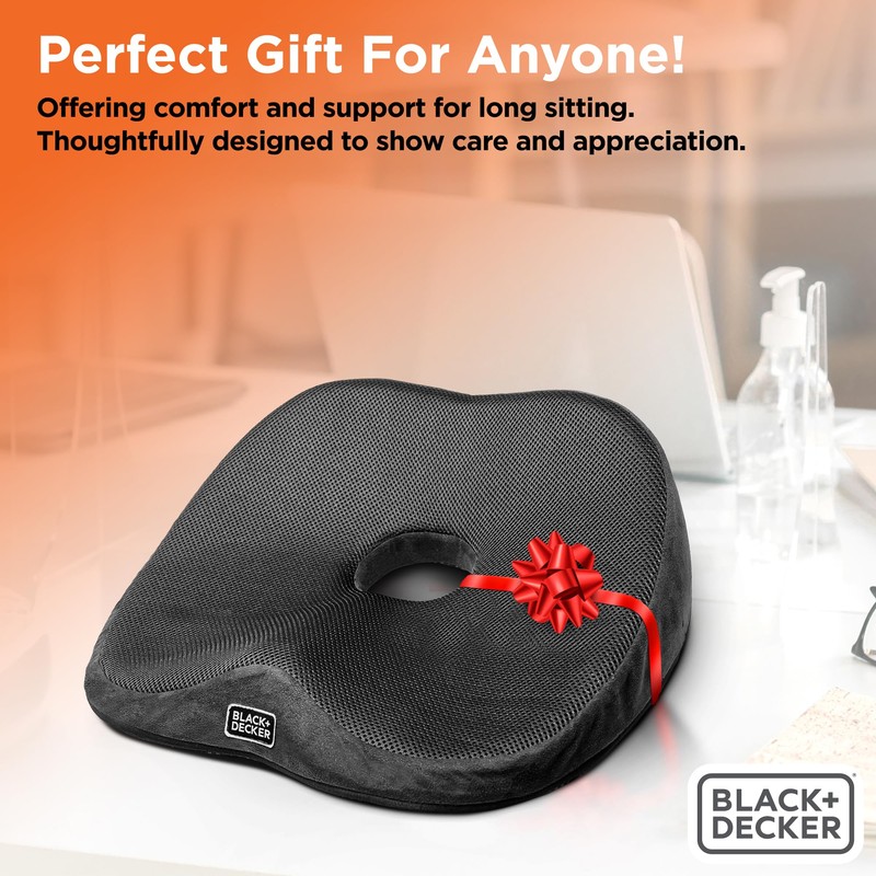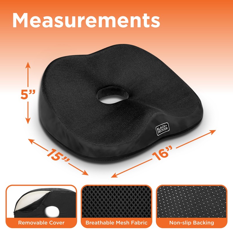 BLACK+DECKER High Back Tailbone Seat Cushion – Memory Foam Chair Cushion for Office, Car, Wheelchair & Airplane – Ergonomic, Non Slip, Breathable Mesh, Sciatic Pain Relief, Washable Cover, Black