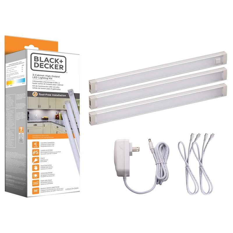 BLACK+DECKER LED Under Cabinet Lighting Kit, 3-Bars, 9 Inches Each, DIY Tool-Free Installation, Warm White, 2700K, 1080 Lumens, 15 Watts, Home Accent (LEDUC9-3WK)