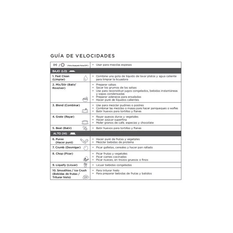 - Programas de la licuadora: Autolimpieza, Batir, Combinar, Desmigar, Hacer puré, Licuar, Picar, Rallar, Revolver, Smoothies