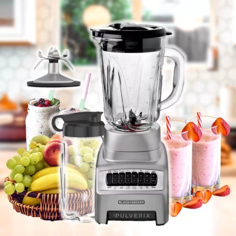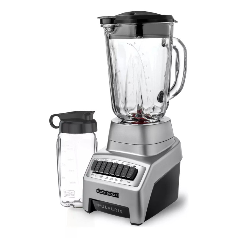 Flexibilidad, Eficacia y Durabilidad son características destacadas de la Licuadora PulverixTM BLACK+DECKERTM para preparar alimentos favoritos con confianza. Un motor de 700 watts de potencia máxima trabaja con cuchillas de 6 puntas en acero inoxidable, más 12 velocidades con pulso que ayudan a pulverizar hielo a nieve y triturar ingredientes duros, convirtiéndolos en sopas y purés, batidos de frutas o granizados y hasta migas de pan o galletas con la consistencia perfecta. Además, brinda la flexibilidad de preparar en la jarra de vidrio con boquilla PerfectPour® y servir sin goteos en el vaso personal para llevar. Diseñada con un sensor IntelliFuseTM para proteger el motor contra recalentamiento y un acople de metal, esta licuadora es un aliado en la cocina.