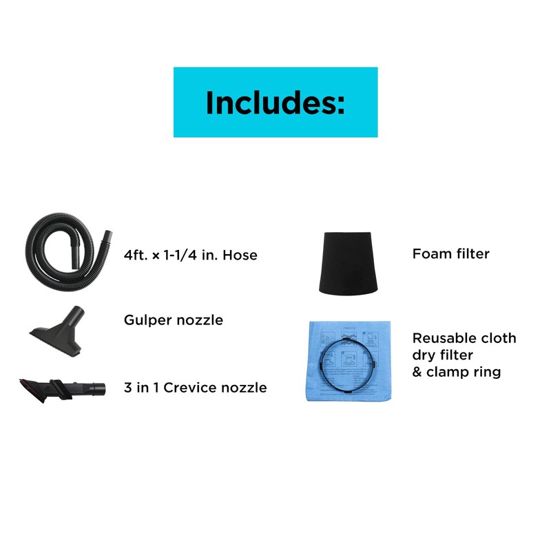 - ACCESSORIES - 4ft Hose * 1, Foam filter * 1, Reuseable filter * 1, Gulper nozzle * 1, Crevice nozzle * 1