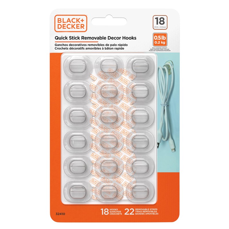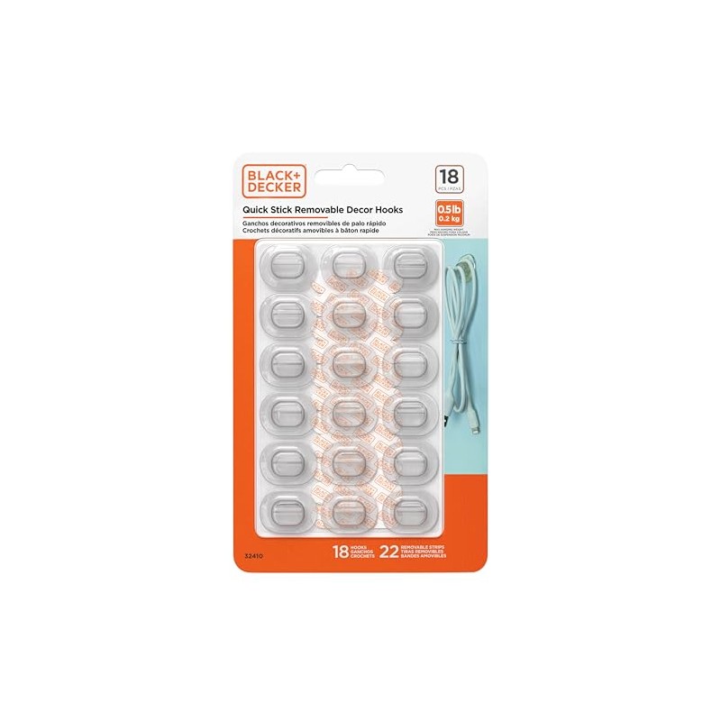 BLACK+DECKER Solid Wall Hooks, Quick Stick Adhesive, Removeable, 18 Wall Hooks, 22 Adhesive Strips, Hang Decorations Without Damaging Walls, up to 0.5lb., Clear
