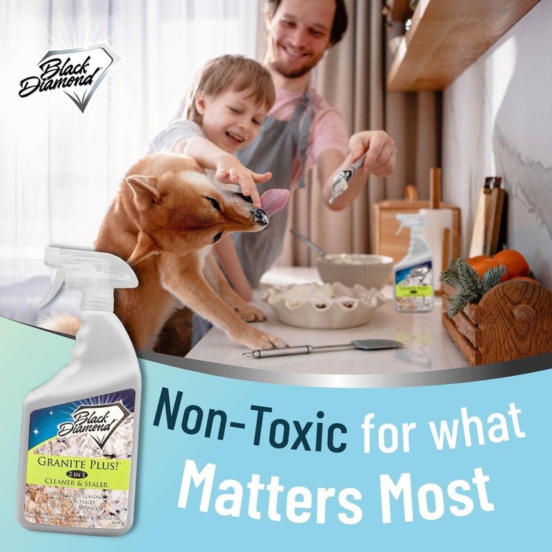 Granite Plus! 2 in 1 Cleaner and Sealer. It is a safe, PH neutral cleaner enhanced with our NEX-GEN granite sealer. Granite Plus! will keep your counters looking beautiful and streak free. Plus every time you clean, you fortify the performance of your granite sealer. We recommend that your granite be re-sealed with a granite sealer every three years along with using Granite Plus. Safe for use on Marble, Travertine, Limestone, Ceramic, Quartz, Corian and Silestone. Simply spray Granite Plus! onto the counter and wipe clean with dry cloth until dry. No rinsing necessary. Granite Plus! is a part of Black Diamond's STONEWORKS' line. This is our premium line of natural stone cleaners & sealers. They are designed to help you easily maintain and protect all of the beautiful stone and tile surfaces in your home or business. STONEWORKS cleaners and sealers are designed to offer you the perfect combination of unequaled product performance and value! Made in the USA
