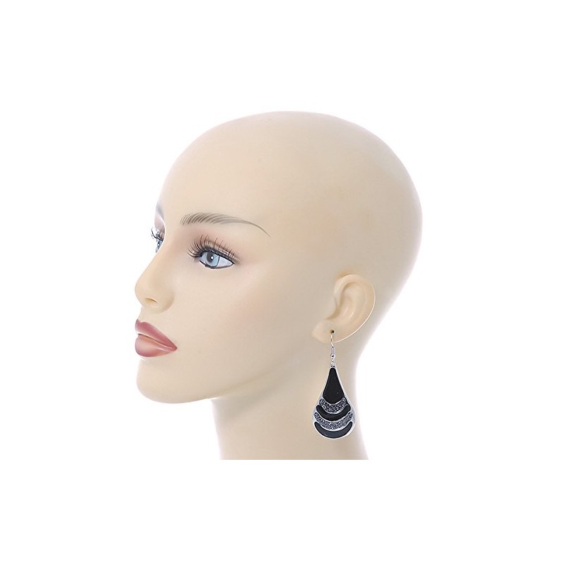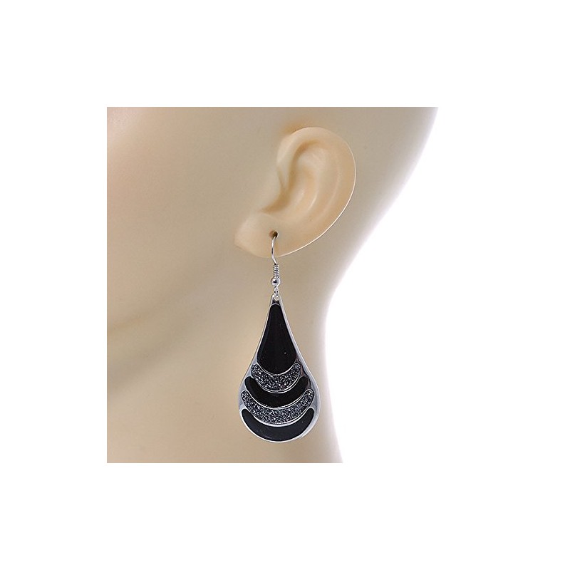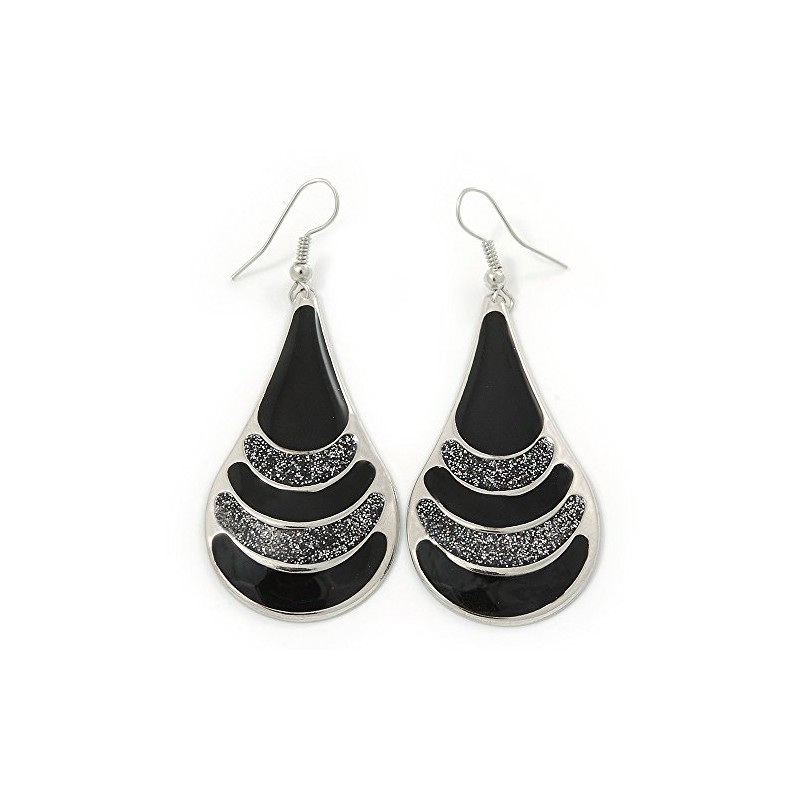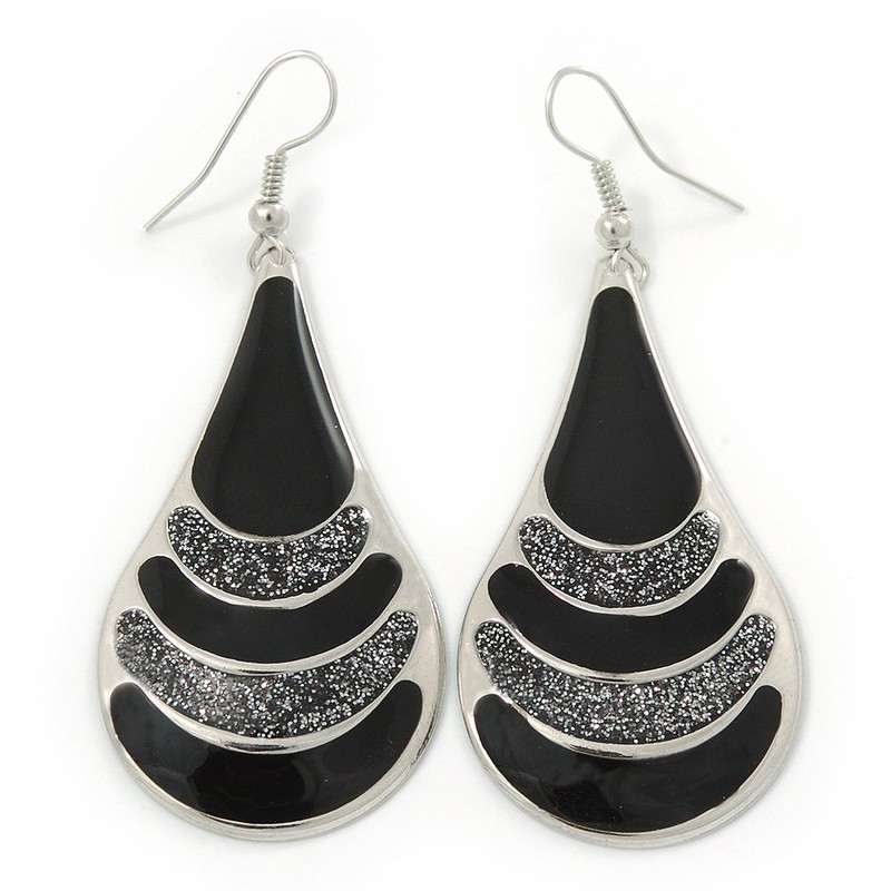 Black Enamel With Glitter Element Teardrop Earrings In Silver Tone - 65mm L