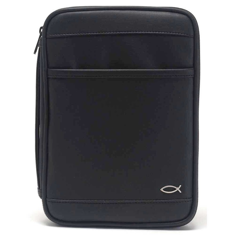 - Made of durable material this Bible cover features a silver fish emblem with full zipper closure and a front pocket for storage.