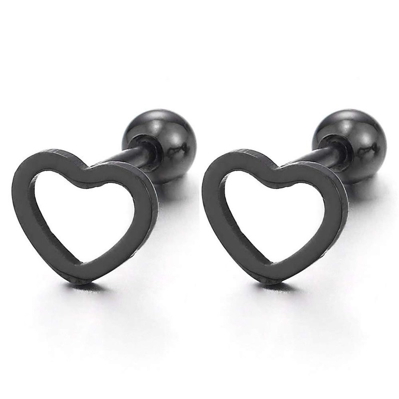 Black Flat Open Heart Stud Earrings of Stainless Steel for Women, Screw Back, 2Pcs(CA)
