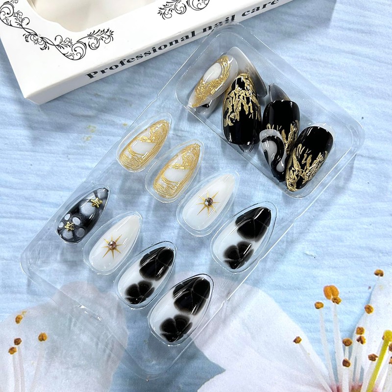 • Fake Nails Design: Our artificial nails use black Flower and ireegular lines design style, give you unique feeling, pretty and comfortable press on nails will give you good mood and add luster to you