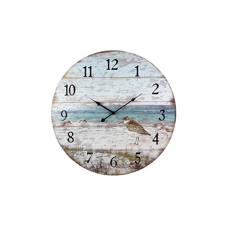A Bella Coastal Decor Exclusive - Wood planks with sandpiper print. Uses one AA battery. This beach gift idea measures 23"Dia. x 1"D