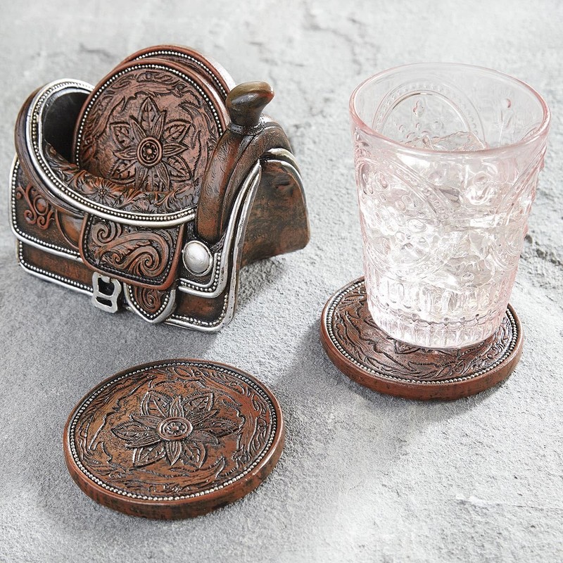 BLACK FOREST DECOR Tooled Leather Saddle Coaster Set with Holder