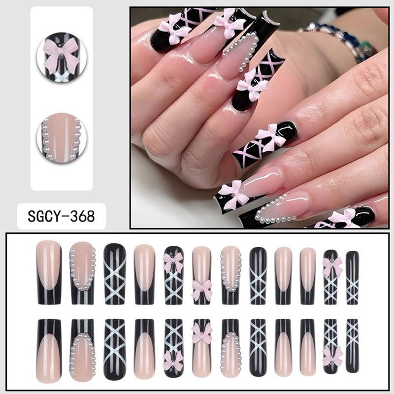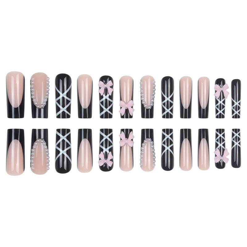 Black French Tip Press on Nails Long Square Faek Nails with Pearls Lines Pink Bow Design Black Nude Full Cover Acrylic Nails Press ons Glossy Glue Stick on Nails for Women 24 Pcs