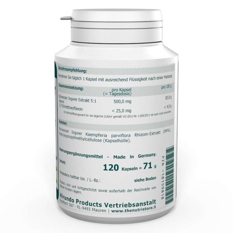 - Each vegan capsule contains 500 mg black ginger extract 5:1, corresponding to 2500 mg powder, with high content of flavonoids such as 5.7-dimethoxy flavon, in the best quality.