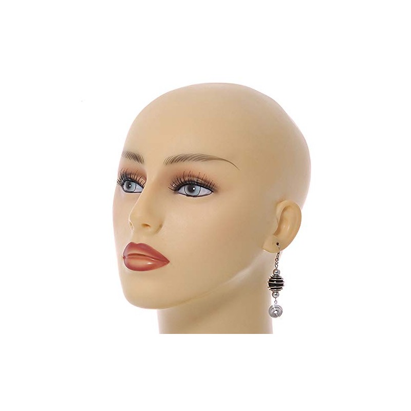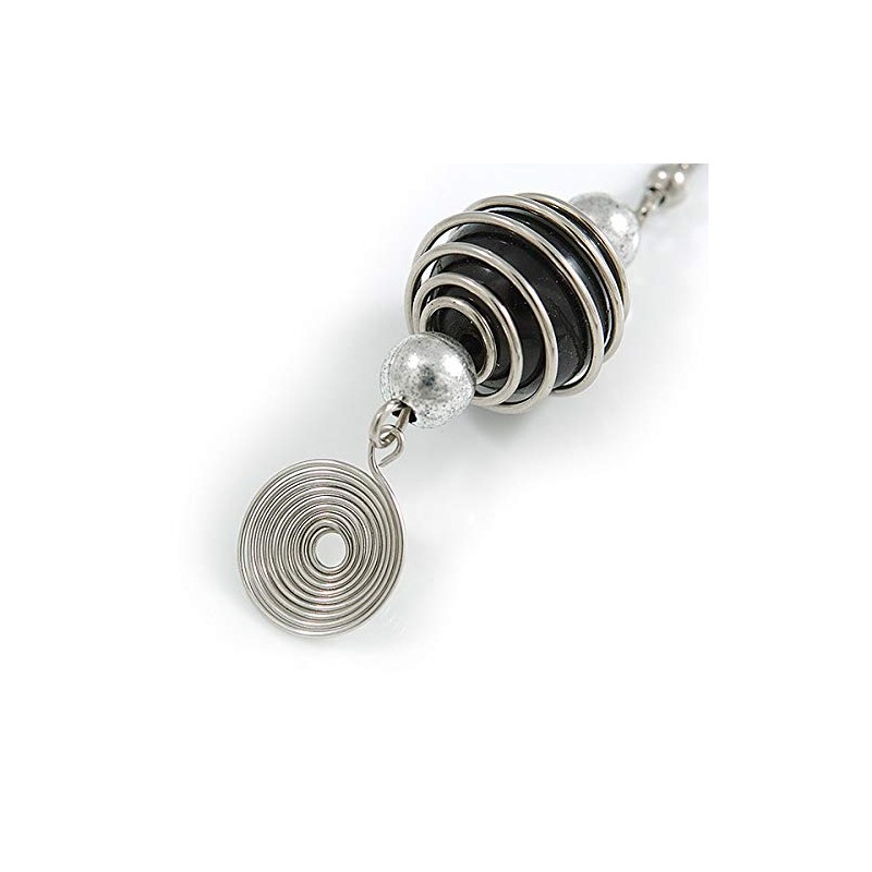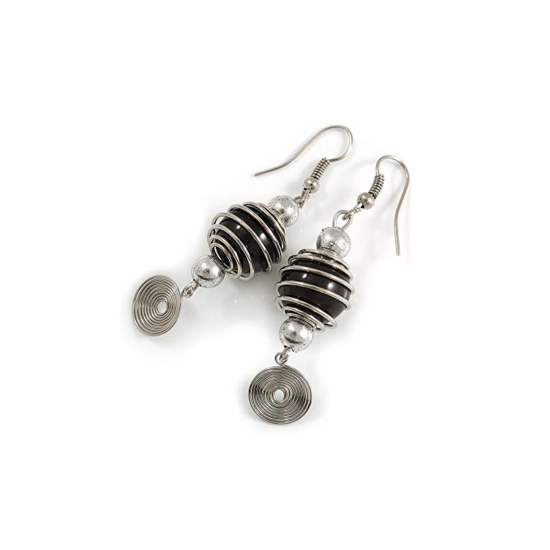 Black Glass Bead with Wire Element Drop Earrings In Silver Tone - 6cm Long