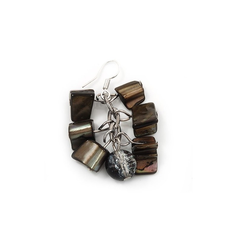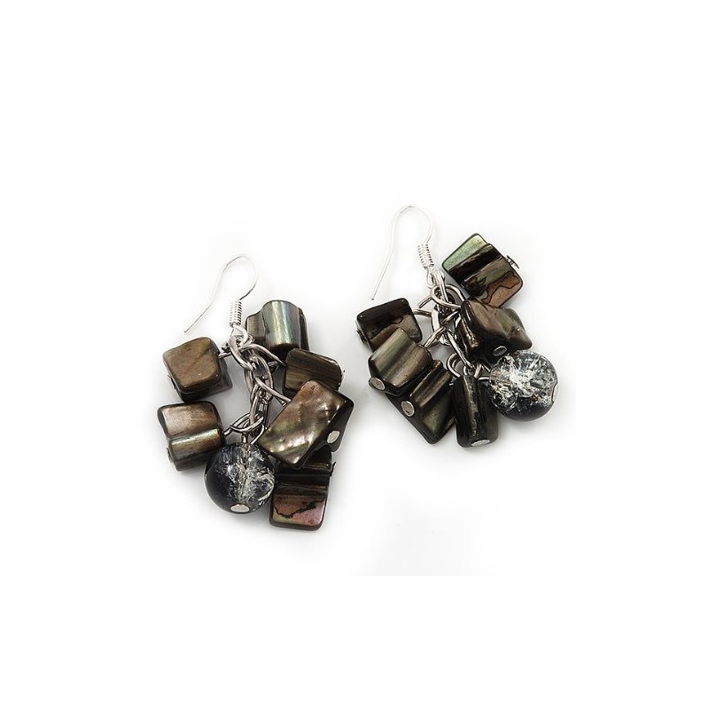 Black/Grey Shell Composite Cluster Drop Earrings/Silver Tone Metal Hooks/ 4cm L