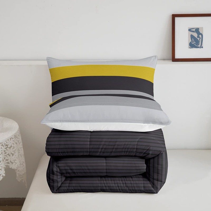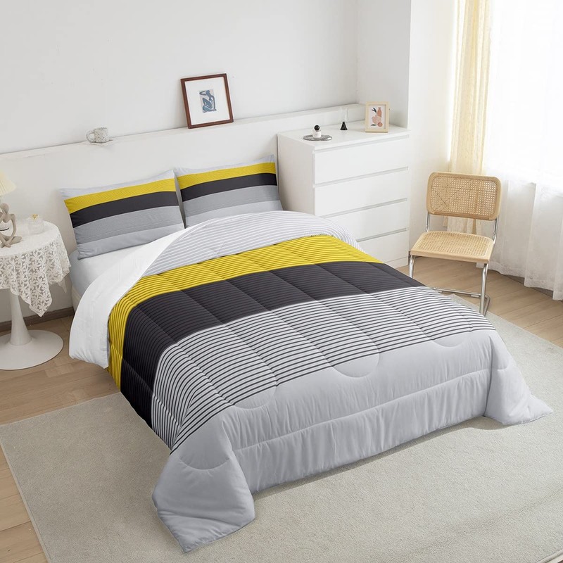 Black Grey Striped Comforter Set, Ombre Yellow Stripes Bedding Set Full Size, Modern Rustic Farmhouse Duvet Insert Geometric Stripes Patchwork Bedding Comforters For Kids Teens Adult Bedroom Decor