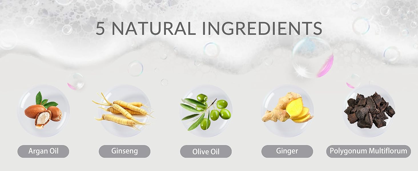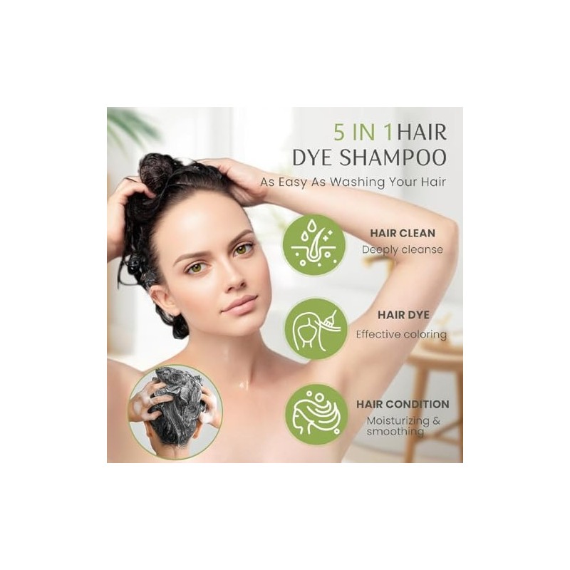 - 5 in 1 New Upgraded Mild Formula: Our natural hair dye blends the extracts of natural ingredients. Inclusion : Argan Oil | Ginseng | Ginger | Olive Oil | Polygonum Multiflorum Extract. for all hair types. New Formula hair color shampoo Combines the Functions of hair dye, Shampoo. Conditions while coloring, penetrate the hair shaft, restoring elasticity, delivers deep hydration and repair from roots to ends—naturally nourished at every stage.