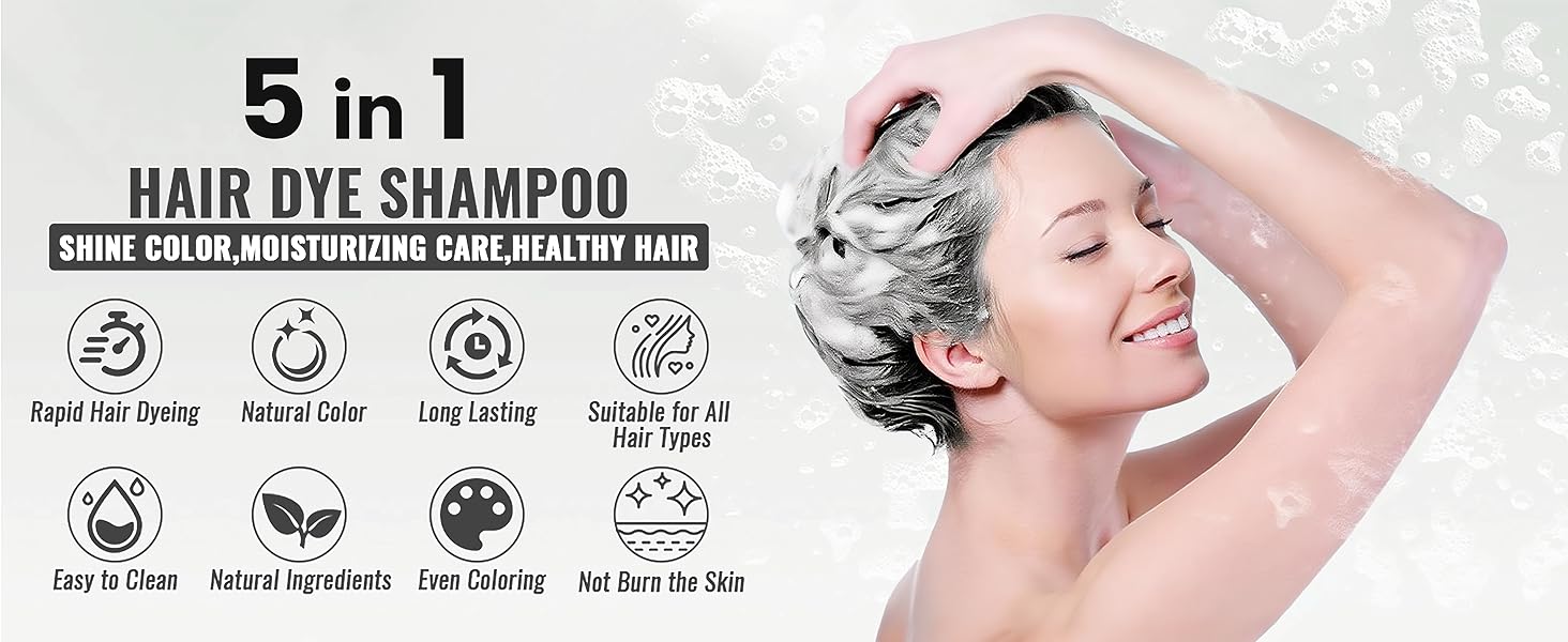 - Suitable for Different Hair Types & Colors : The instant hair dye shampoo 5 in 1 is suitable for various hair types and colors, including dry, oily, damaged, straight, curly hair, etc. Whether your hair is white, gray, light brown, etc., suitable for both men and women, allowing your hair to regain its youthful appearance,you can use this hair dye shampoo to change the color of your hair.