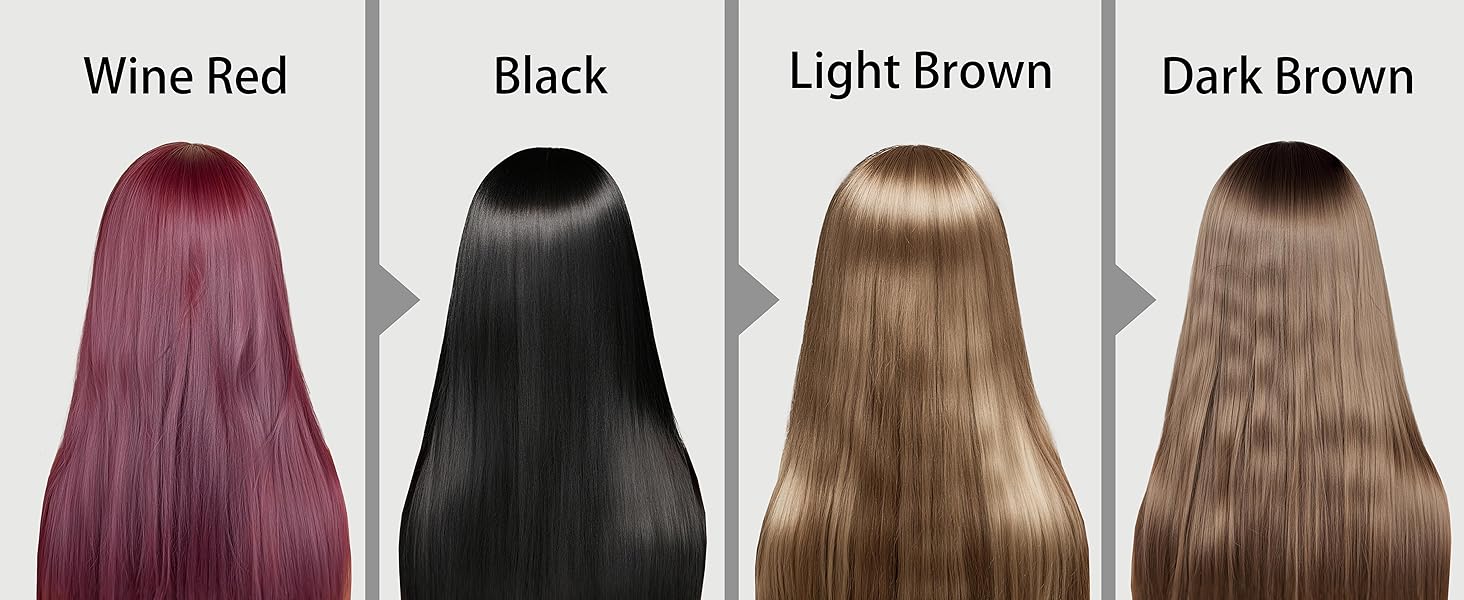 - Magic Hair Dye Shampoo: Black, Dark Brown, Light Brown and Wine Red are four colors designed specifically for grey hair, which can completely cover grey hair and you will no longer be affected by it.Does not give out a foul smell or stain your skin. Take a skin test 24 hours before first use.
