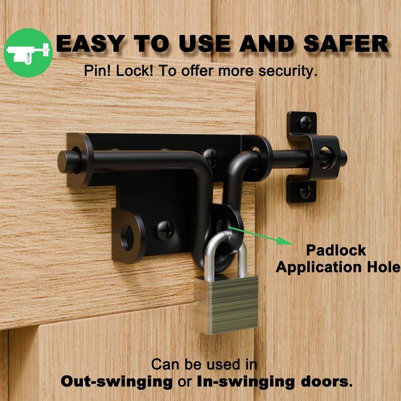 • 【Safety & Privacy】Our slide bolt gate latch is equipped with padlock hole.You can padlock it with a regular padlock (padlock not included) for added security. Lockable outdoor latch can be used to prevent people from trespassing in your room or to prevent children or pets from opening the door on their own. Outdoor latch hardware protects against intruders and wildlife.