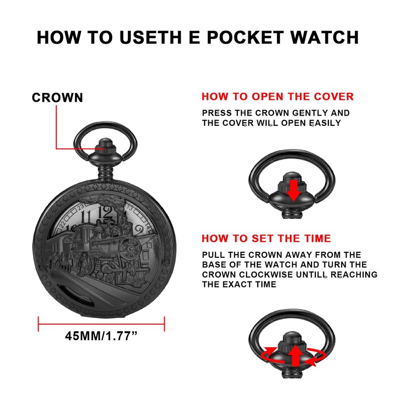 • Black hollowed out right locomotive design: This is a unique quartz pocket watch with a black hollowed out right locomotive and Arabic numeral dial, which is very retro and fashionable.