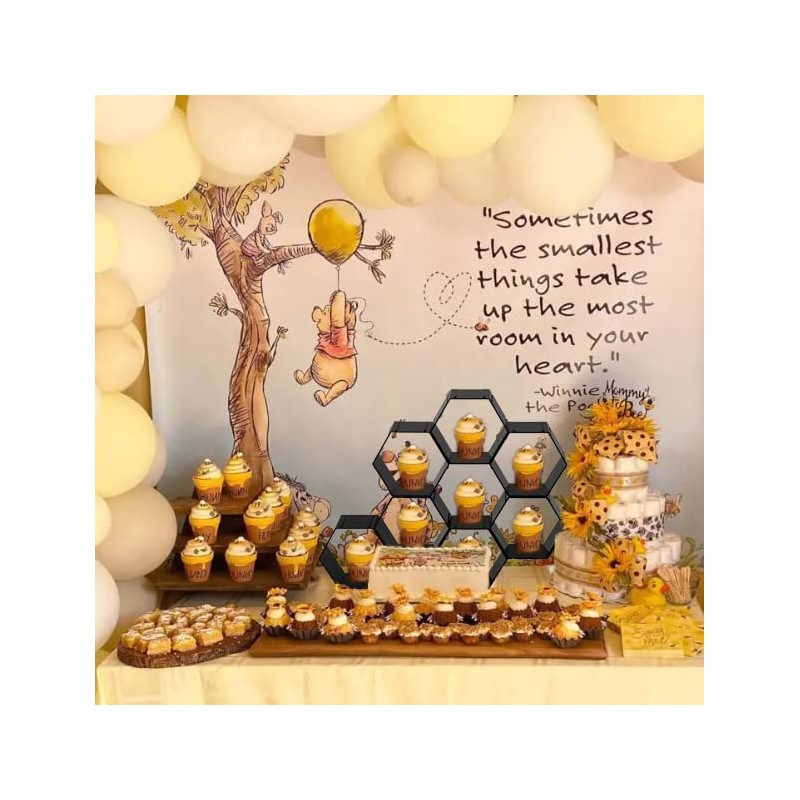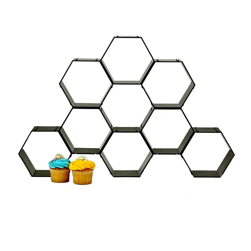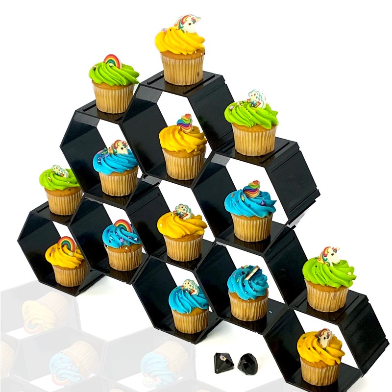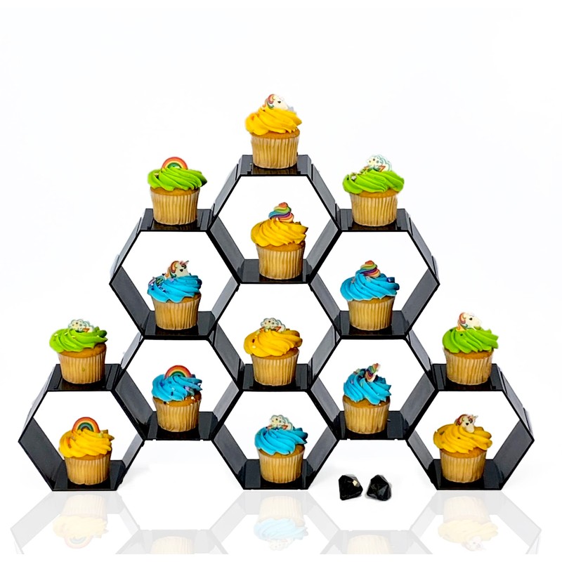 Hexagon Honeycomb Cupcake Holder Want to please guests with your creative and unique presentation? Then this cupcake holder is exactly what you need! Kwirkworks cupcake stand or dessert display is designed with a gorgeous layout. With its hexagonal blocks, cookies, cupcakes, tartlets, and desserts look more tempting and delicious. With 8 blocks (each having 6 sides which measure 6''x 3.25″ x 5.5″) that can slide together in any shape and design. arrange them into a cupcake tower, a horizontal cookie display (each with different types of cookies) or use each block separately for each delicacy. Cool! Isn't it? Our tiered cupcake stand is very easy to clean, just wipe it with a wet paper towel and it's all cleaned up. This cupcake stand has a detachable block function which makes it a very convenient item for storage in kitchen cabinets. To add a fun element in your gatherings, festivities, and parties. This cupcake/cookies/dessert holder goes perfectly with every party theme which makes it a worthy investment. Organize delicious desserts on this cake stand and fun to your party.