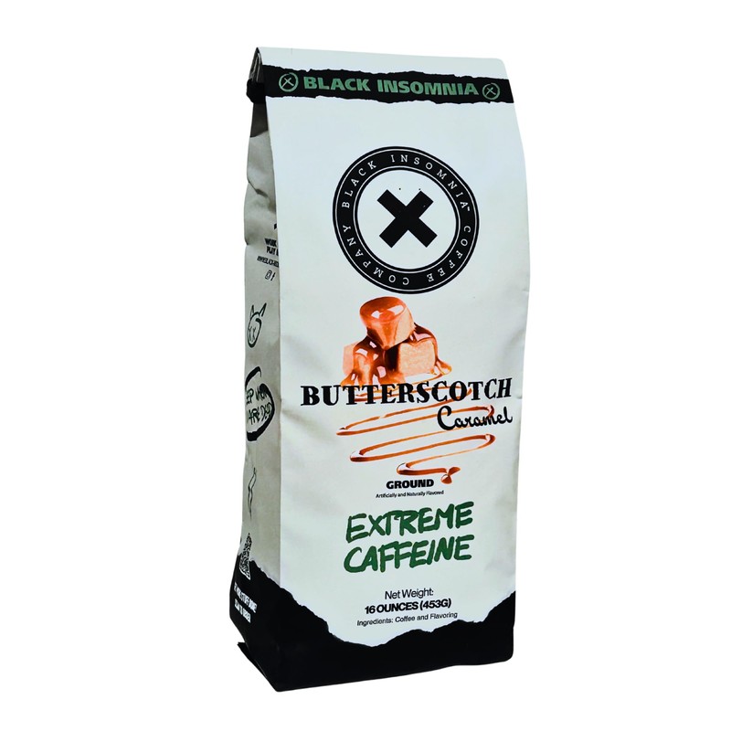 Black Insomnia Extreme Caffeine Coffee - World's Strongest Highly Caffeinated Coffee - Butterscotch Caramel Flavored, Classic Roast, Ground - 1lb