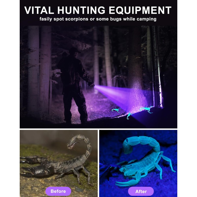 - MULTIFUNCTIONAL BLACKLIGHT FOR EVERYDAY USE: This versatile blacklight flashlight is an essential tool for a variety of uses, including detecting pet urine stains, identifying cat ringworm, curing resin, locating scorpions, spotting tomato hornworms, inspecting fluorescing rocks, minerals, amber, jewelry, or uranium glass, tracking blood, detecting AC leaks, cleaning bathrooms, checking paint, and more.
