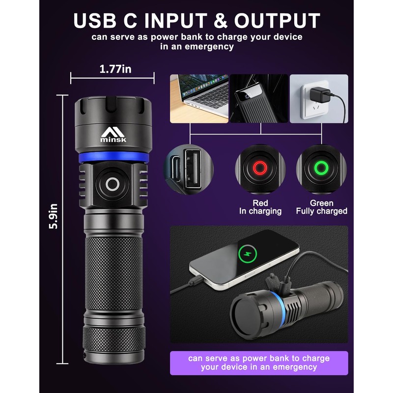 - USB-C RECHARGEABLE WITH POWER BANK: The black flashlight includes a built-in USB-C input for fast charging. In addition to the normal USB input rechargeable function, this rechargeable flashlights also can serve as a power bank, allowing you to charge your phone or other devices on the go using the USB output.