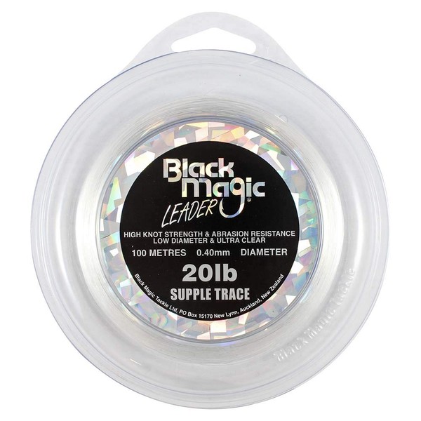 This Black Magic Supple Trace Leader is manufactured from Japanese copolymers. It is supple, sensitive and features high abrasion resistance. Great knot strength, low diameter and ultra clear - this leader is excellent for a variety of uses. Plus it's packaged into a compact dispenser pack that fits in your tackle box or Leader Feeder, which means you can always reuse it again as a lure holder. Mint!