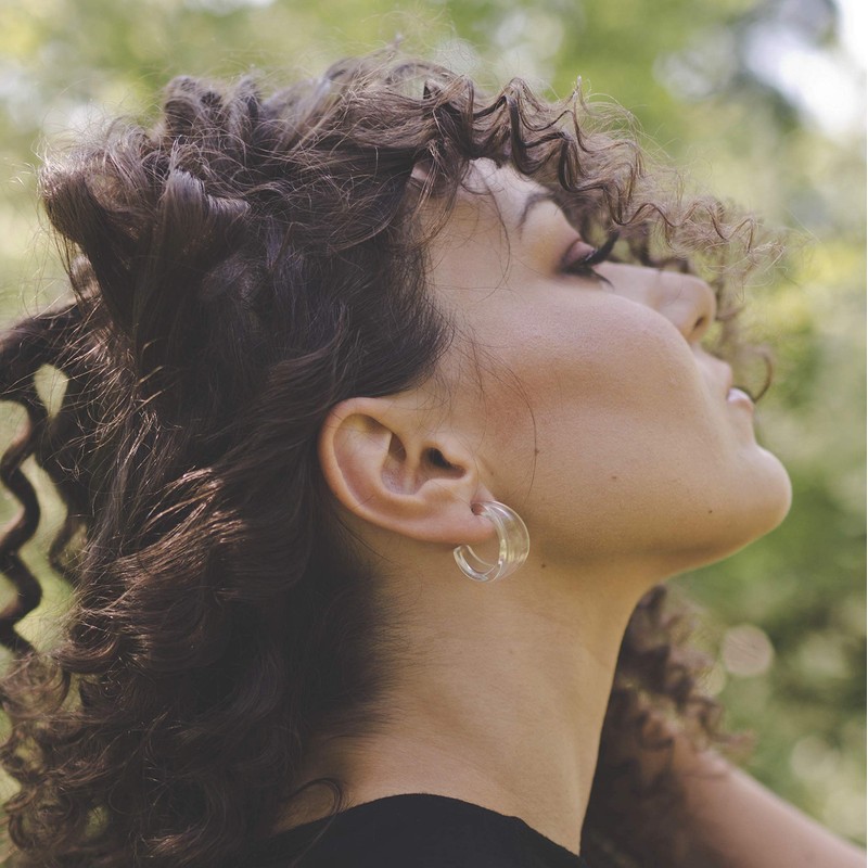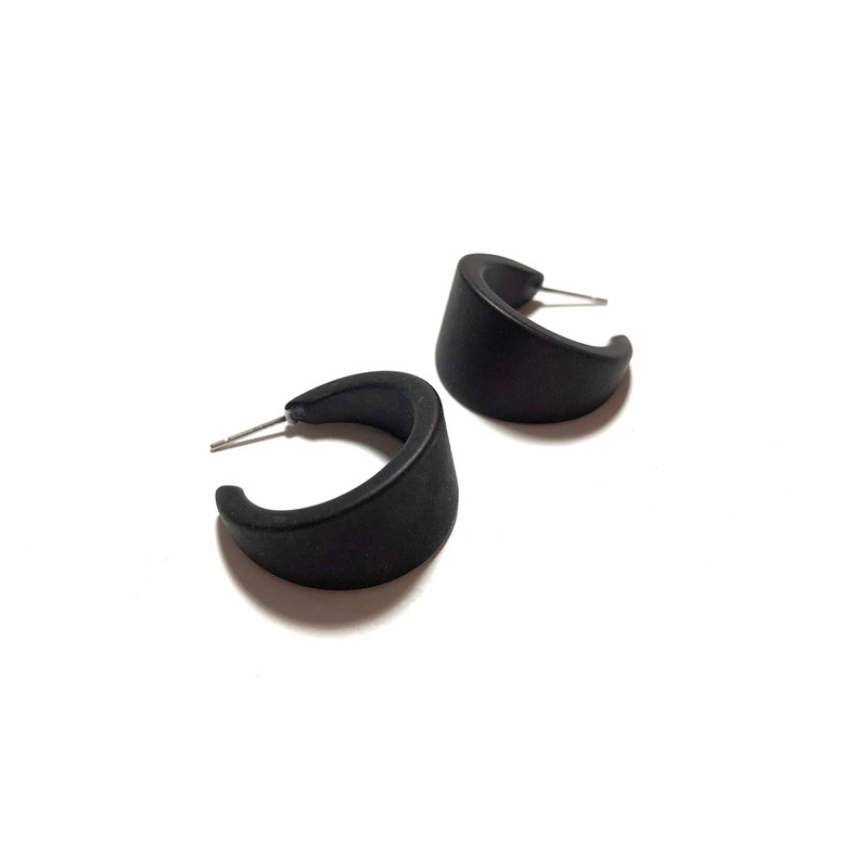 Black hoop earrings in the small size of the Marilyn style hoop, a modern style hoop with a frosted finish. The Marilyn Hoop is a tapering or waning shape that starts & ends at a point and widens in the middle. The small version of the Marilyn Hoop measures 1" or 24mm in diameter and 14mm in width. Check out the last pic of the model wearing this size & style in the Cobalt Blue to get an idea of what they'll look like when you rock them! Most all earrings are made with vintage lucite parts that were made in Rhode Island or NYC in the 1960's - early 80's by Best Plastics or another manufacturer for design houses of that era. We hand-set them with surgical steel earring posts and they have sturdy surgical steel/acrylic backings on them as well. Light-weight & fun to wear.