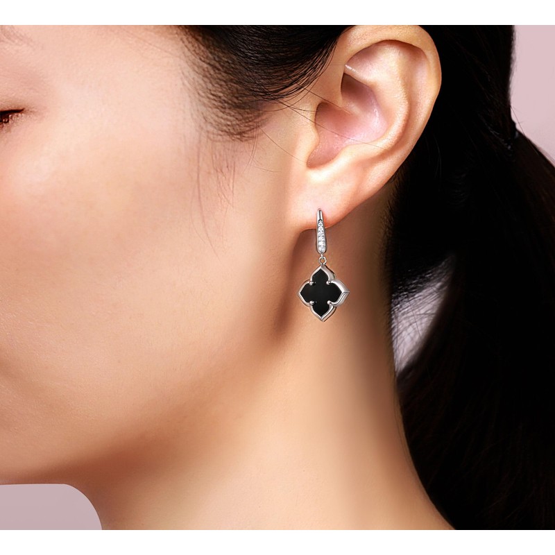 Black Onyx Four Petal Flower Dangle Earrings for Women with Cubic Zirconia in 925 Sterling Silver by Lavari Jewelers