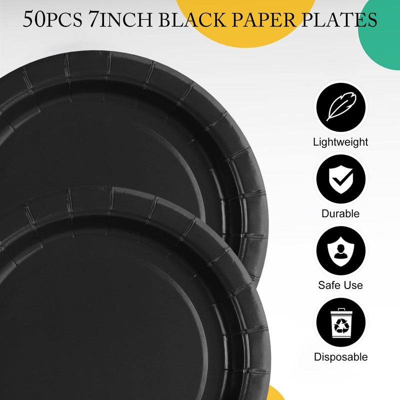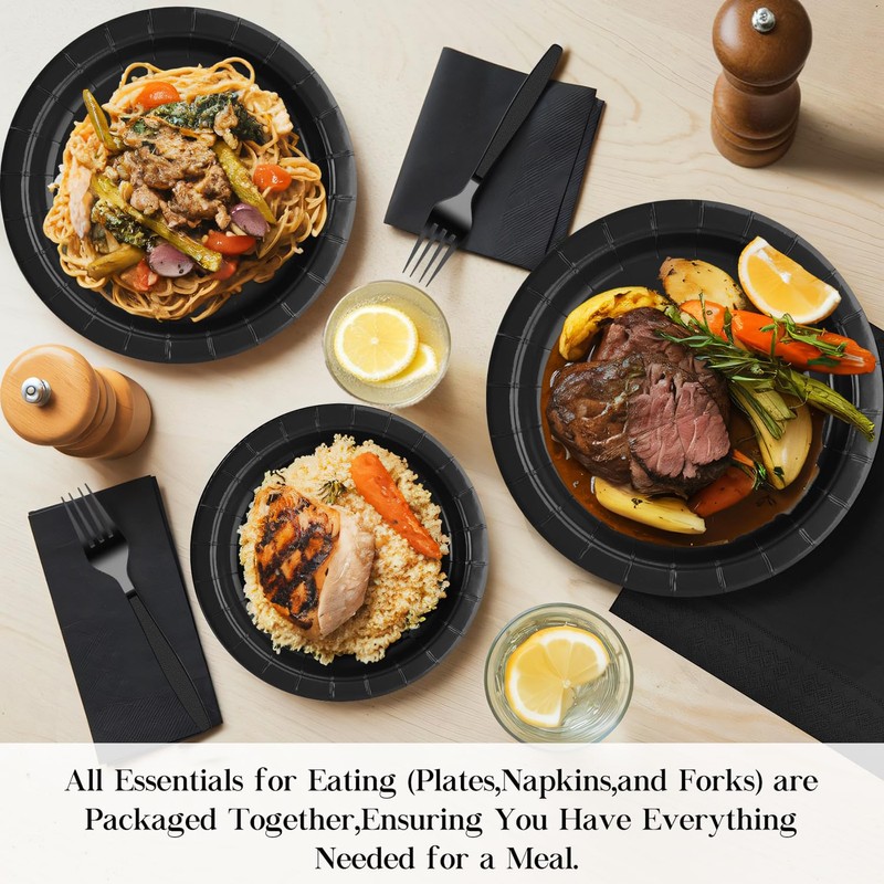 - Convenient Complete Dinnerware: This party supplies includes 50 7 inch black paper plates, 50 5 inch paper napkins, and 50 7.08 inch plastic forks,Meet the most basic tableware needs for your party,providing a convenient disposable solution