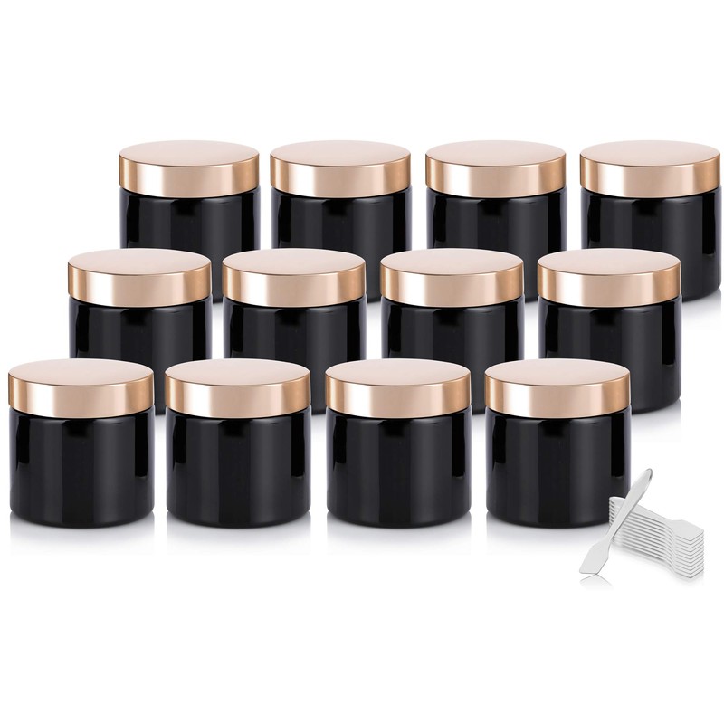 Black PET Plastic (BPA Free) Large Refillable Jar with Gold Metal Overshell Lid - 16 oz (12 Pack) + Spatulas