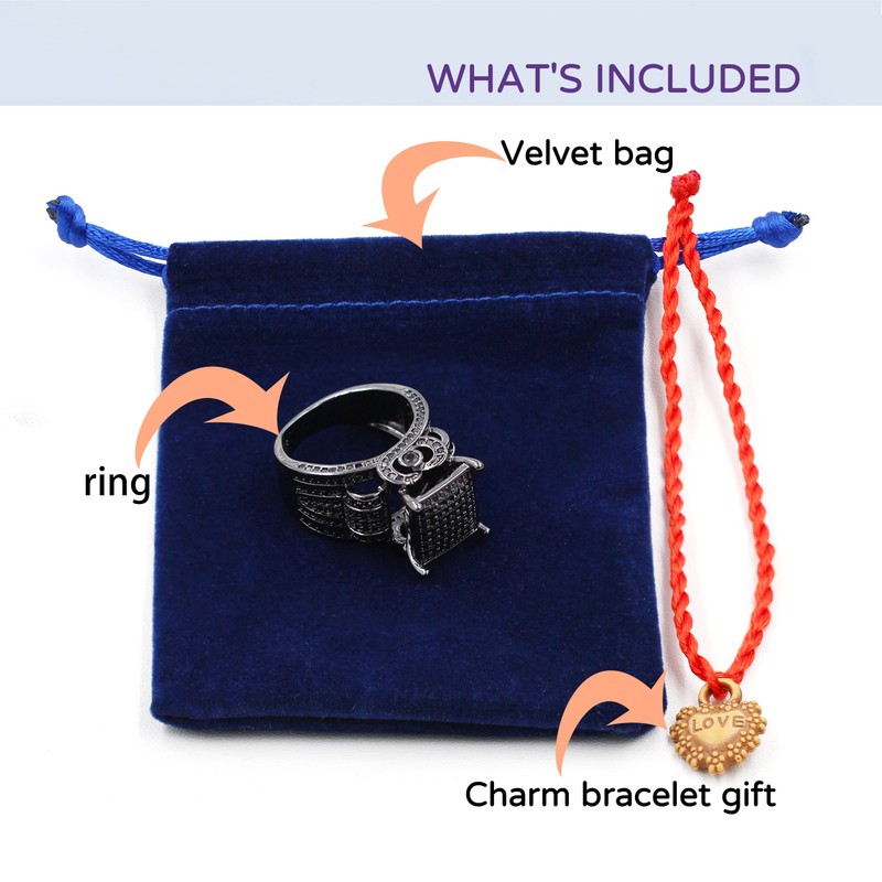Black Plated Big Square Cocktail Ring, Heart Side, 0.4" Wide Party Ring Micro...