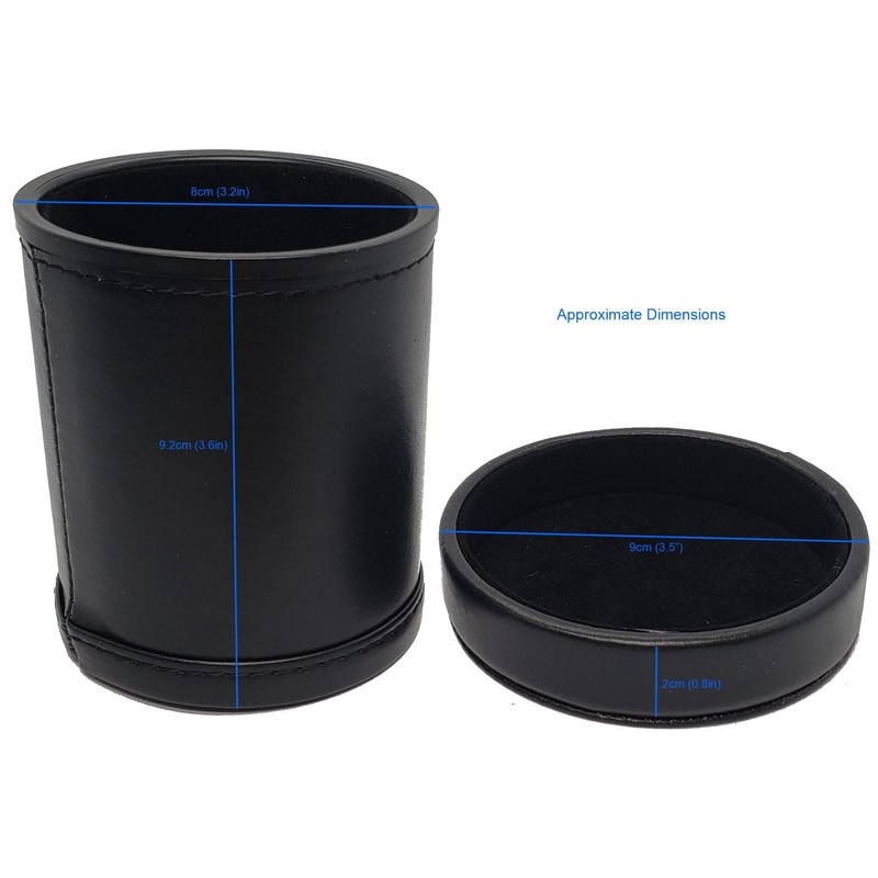 Black PU Leather Dice Cup, Black Premium Felt Lined with Removable Matching Lid Cover Tray, Plus (6) 16mm D6 White Dice Squared Corners