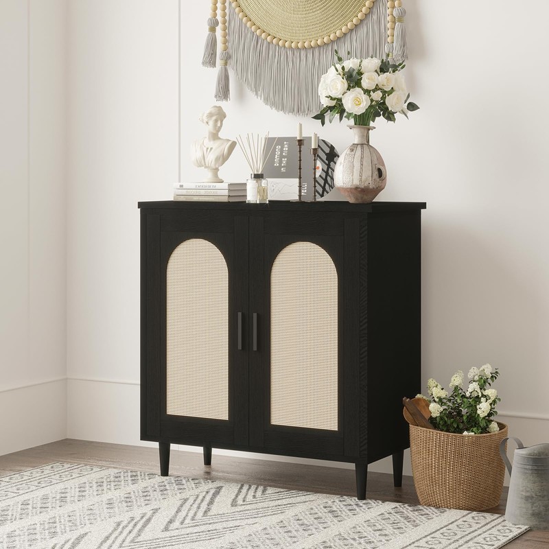 Black Rattan Buffet Cabinet with Storage, Single Door Accent Console Table for Entryway, Dining Room & Kitchen, Compact Sideboard with Adjustable Shelves, 35.2" Small Storage Cabinets(2pcs)