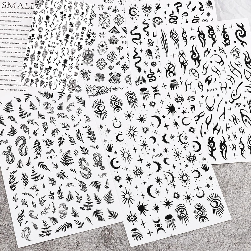 - Package Contain: You will get 6 sheets delicate black nail stickers,Includes all sorts of patterns: black rose, snake, eye, sun, moon, black leaves, etc etc to design patterns can be used for nail decoration.