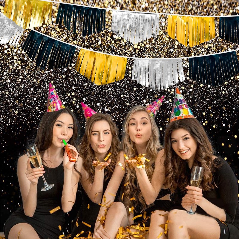 - Using Occasion - These black gold silver party tassel pennant banners are very easy to hang and decorate both indoor and outdoor.they can be hung from branches and walls,trees,tables,windows or door to spices up, It can be used for both kids and adults.Such as graduation party,anniversary party,birthday party,retirement party,Christmas,bridal shower,bachelorette party,hen party,Halloween,wedding,baby shower,holiday party,and so on.
